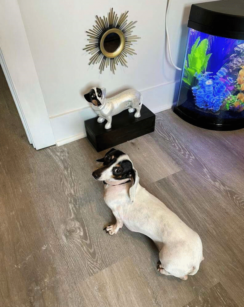 Soon, the room was no longer just a safe spot for his dogs — it was a fully realized canine retreat. A sparkling chandelier cast warm light over tiny end tables topped with decorative accents. Shelves held carefully arranged books, and a cozy faux fireplace added charm. Mazer even included a fish tank to create gentle movement and calming sounds. Throw pillows and miniature décor made the space feel like a luxurious yet playful lounge.