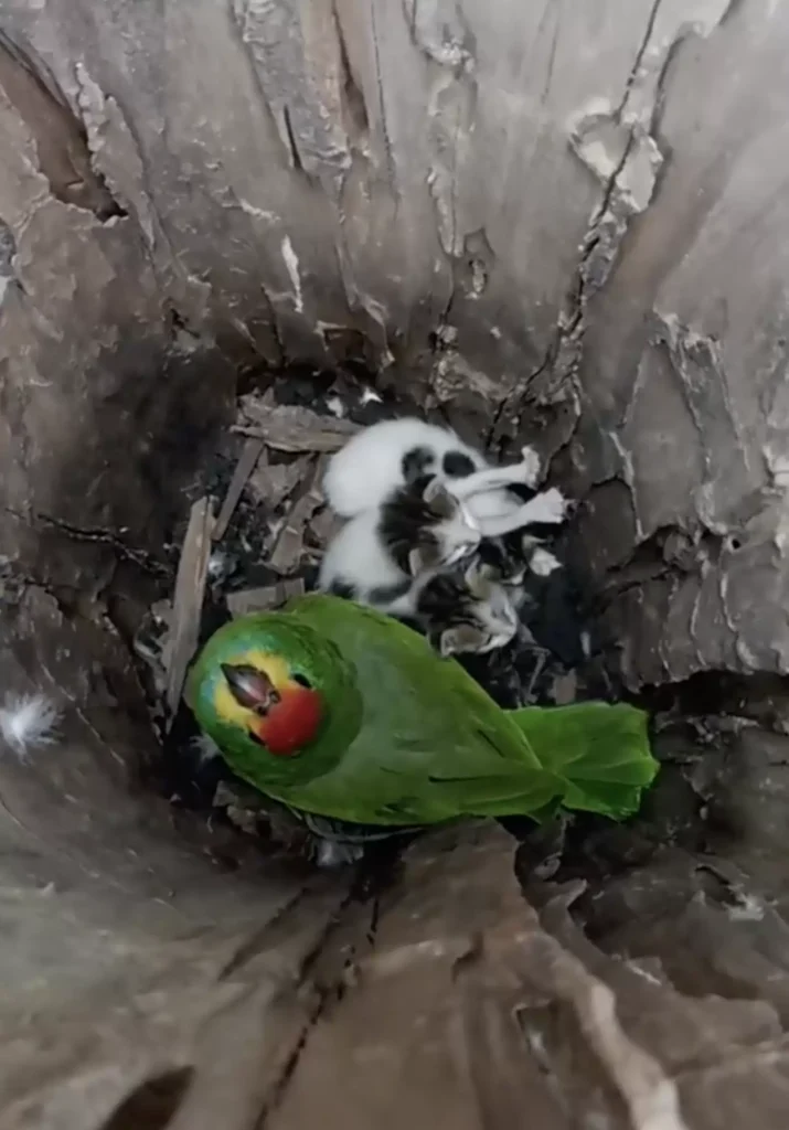 He approached the fencepost, and as he peered into the hollowed-out space that Louro sometimes used as a nest, he was met with a truly baffling sight. There, nestled in the warmth of the nest, was not a clutch of parrot eggs, but a wriggling, mewing pile of fur. Louro, his parrot, had apparently found and adopted a litter of three tiny, newborn kittens.