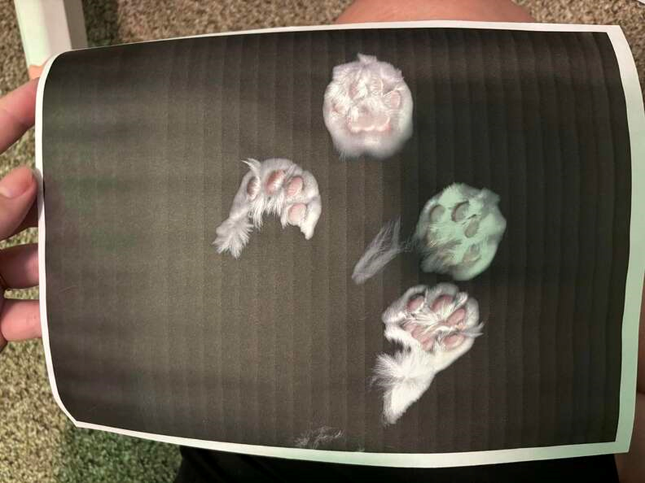 Bilbo, a magnificent creature of black velvet fluff with a dazzling white bib and matching mittens, was having a philosophical morning. His human, Ava, had made the grave error of leaving a cardboard box on the pristine wooden floor. To Bilbo, a box was not merely a container; it was a sanctum, a thinking station, and a statement of possession. He settled into the compact space, his body forming a perfect circle of contentment. From his vantage point, peering over the edge with his huge, golden-green eyes, he surveyed his domain. His white whiskers, long and formidable, twitched in contemplation. This box is acceptable, he concluded. But what, truly, is the essence of fluff? This question led him to his next great project: self-documentation. Bilbo was supremely proud of his fluffy assets, particularly his paws, which were rumored to be the fluffiest in the entire county. They were miniature snowdrifts, complete with delicate pink toe beans hidden beneath a glorious overgrowth of white fur. He had often observed Ava documenting things—papers, receipts, photographs—using the mysterious, warm, humming black box known as The Canon Printer. It was a machine of great importance, often generating warm air, which was a comfort Bilbo deeply appreciated. And so, with the quiet determination only a cat on a mission can muster, Bilbo leaped from his cardboard throne and ascended the printer. Ava had just printed something, and the machine was still radiating a cozy heat—a perfect spot for a brief, self-satisfied nap. He settled his enormous, velvety head right on top of the Canon logo, allowing the ambient warmth to soothe his intellectual fatigue. Unbeknownst to him, the page that had just rolled out beneath his chin was the physical evidence of his human’s recent, slightly obsessive behavior: a photographic tribute to his paws. Ava, completely in love with his unique floof, had carefully taken high-definition photos of his mittens, capturing every glorious, wispy strand and every soft, innocent pink pad. She had then printed them out, four perfect, magnified portraits of his puffy pink toe beans and the dazzling white fur that fanned out from them, all set against a striped charcoal background. Bilbo, sleeping soundly on the printer, was resting right on the factory that created his own fan art. He was, quite literally, sitting on his own fame. Ava walked back in, saw the cat on the printer and the printout beneath, and nearly dropped her mug. She had caught Bilbo, the philosopher-king, in the very act of unknowingly endorsing his own celebrity. “Bilbo,” she chuckled, lifting the sheet of paper, “You really are the fluffiest tyrant who ever lived.” Bilbo opened one golden eye, gave her a slow, deliberate blink—the cat equivalent of an eye-roll—and settled back down deeper into the printer’s warmth. His message was clear: Document my magnificence, human. But do it quietly. I’m resting on the job.