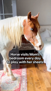 A magnificent pinto steed, with striking azure eyes, gracefully steps inside a personal sanctuary. This creature possesses a lovely blonde mane, cascading down its powerful neck. Its coat is a beautiful patchwork, of rich chestnut splotches, over a canvas of pure alabaster. The animal stands upon an ornate crimson rug, a splash of vibrant color on the hardwood flooring. This companion makes a daily pilgrimage, drawn by an unusual fascination. It has come to visit its beloved human, inside her private sleeping quarters. The primary motivation for this intrusion, involves a playful interaction, with the chamber’s soft textiles. He comes to frolic amongst the linens, a unique morning ritual. This peculiar habit is an endearing spectacle, a testament to their special bond. The room’s ambiance is tranquil, yet filled with anticipation. Every dawn brings this charming event, a horse’s gentle trespass. His presence fills the space, both physically and emotionally. The text overlay explains this phenomenon, a horse’s love for bedsheets. This domestic scene is quite extraordinary, blending the equestrian world, with intimate home life. A truly remarkable friendship, captured in a single, peaceful moment. The scene is set for amusement. His quest for sheets is about to commence.