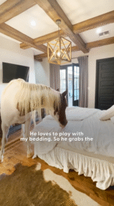 The handsome equine, now deeper within the room, approaches the neatly made bed. He lowers his impressive head, showing immense curiosity for the bedding. His affection for these fabrics is quite clear, a tactile obsession he enjoys. He begins to gently grab the material, with his soft lips. The chamber itself is elegantly designed, featuring exposed timber beams overhead. A sophisticated geometric chandelier hangs centrally, casting a warm glow throughout. A large screen is mounted on the far wall, overlooking the entire setting. The bed is dressed in layers of snowy white fabric, including a fluffy comforter. A ruffled bed skirt adds a touch of rustic charm, complementing the wooden elements. This gentle giant seems completely at ease, exploring textures with his mouth. His blonde forelock dangles before his face, partially obscuring his focused gaze. The caption reveals his deep fondness for this activity, an integral part of his routine. It’s a quirky, adorable behavior, demonstrating his playful nature. The scene showcases a profound level of trust, between the animal and its owner. He is allowed such liberties, to explore and engage with his surroundings. A cowhide rug lies on the floor nearby, enhancing the sophisticated, rustic decor. This is not merely an animal in a house; it is a cherished family member. His gentle mouthing of the duvet, is a simple, joyful expression.