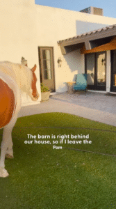 Here we observe the splendid creature outdoors, standing on a patch of verdant artificial grass. He is positioned on what appears to be a backyard patio, a comfortable, enclosed space. The home’s exterior is a clean, off-white stucco, radiating a serene, sun-drenched quality. Large glass doors with black frames, offer a glimpse back into the dwelling. The barn, his primary residence, is conveniently located just behind this house. This proximity allows for such frequent, casual visits, making his indoor strolls possible. He glances back over his shoulder, perhaps waiting for his human companion. The sunlight catches his piebald coat, highlighting the contrasting colors. A small turquoise armchair sits in the background, adding a pop of bright aquamarine. Potted plants and outdoor lighting fixtures, adorn the building’s facade. The narrative explains the geographical layout, clarifying how he gets inside so easily. The barrier is minimal, a simple rope fence sectioning the turf. This setup fosters a unique, integrated lifestyle, where equine and human lives merge seamlessly. The setting feels peaceful and private, a safe haven for this special animal. His posture is relaxed and confident, showing he feels secure in this environment. The architecture suggests a modern, Southwestern style, blending comfort with elegance. This image provides context for the story, illustrating the unique living arrangement. He enjoys the freedom to roam, from his stable to the main domicile. A life of incredible privilege and affection, is evident in this sunlit scene.