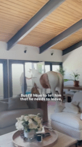 The perspective now shifts slightly, showing the interaction from a different angle. The woman continues to guide her equine companion, her hand still affectionately on his head. It seems the time for his indoor adventure is ending, and he must now depart. The caption indicates a reluctant farewell, “But I’ll have to tell him that he needs to leave.” His large body fills the doorway, a gentle giant being politely ushered out. His hindquarters are visible, showcasing the bold patterns of his coat. The living room’s comfortable arrangement, is seen more broadly in this frame. A plush, slipcovered armchair sits to the right, exuding an aura of relaxation. A tall, leafy plant in a pot, adds a touch of nature to the indoor space. The sloped, wood-paneled ceiling, remains a prominent design feature. The moment is tender, not harsh, a necessary end to a pleasant visit. She is not scolding him, but lovingly redirecting him back outside. This interaction speaks volumes about their relationship, built on mutual respect and gentle rules. He has had his fun, and now it is time to return to his own domain. The dialogue implies a regular conversation, a routine she has with her beloved animal. Her body language is soft and persuasive, not forceful or demanding. This fleeting moment captures the reality, of sharing one’s home with a horse. There are boundaries, even in the most loving of interspecies friendships. He must eventually go back to the barn, until his next delightful intrusion.
