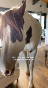 This image offers an intimate close-up, focusing entirely on the horse’s expressive face. His luminous blue eye is a captivating focal point, a window into his gentle soul. Sunlight filters in from a nearby door, casting a soft, ethereal glow upon him. His forelock, a mix of flaxen and brown strands, falls delicately across his forehead. He is looking slightly downwards, his expression one of serene contentment. The caption reveals the owner’s profound emotional response, “that touches my heart so deeply because…” This phrase suggests a deep, unspoken connection, a sentiment that words can barely capture. His willingness to seek her out, to be close to her in her own space, is a powerful display of affection. It is an act of trust and companionship, that resonates deeply with his human. The background is softly blurred, keeping the viewer’s attention on his tranquil demeanor. One can see the edge of a piece of furniture, but the details are indistinct. The warmth of the lighting, complements the warmth of the emotion. This is more than just a pet’s visit; it is a heartfelt communion. The image freezes a moment of pure feeling, the quiet joy of being loved by such a noble being. The incomplete sentence in the caption, invites the viewer to understand the feeling, rather than just read the words. His calm presence is a gift, one that she clearly cherishes immensely. The delicate whiskers around his muzzle, are visible in this detailed shot. Every feature communicates his sweet temperament, and the depth of their extraordinary bond.