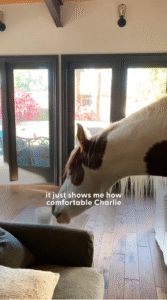 Here, we learn the magnificent creature’s name: Charlie. He is exploring the living room with gentle curiosity, his head lowered towards the coffee table. He appears to be sniffing a white candle, or another small decorative object. This act is a powerful demonstration, of how completely at home he feels. The caption explicitly states this, “…it just shows me how comfortable Charlie is.” He is not timid or anxious, but confident and inquisitive within these walls. Large glass doors in the background, reveal a vibrant, sun-drenched garden outside. Brilliant pink bougainvillea blossoms, add a stunning splash of color to the view. The interior remains a picture of serene style, with its neutral-toned furnishings. Charlie’s presence does not disrupt the harmony; it enhances it, adding life and wonder. His long, thick mane hangs like a silken curtain, a testament to his excellent care. The image captures a moment of quiet investigation, a horse behaving like a house cat. This behavior is the ultimate compliment, a sign that he views this house as part of his territory. He feels safe and secure enough, to let his natural inquisitiveness take over. The owner finds immense joy, in observing these small gestures. They are proof of his happiness, and the success of their unique lifestyle. Charlie’s comfort is her comfort, his contentment brings her profound happiness. This simple action, sniffing a candle, is laden with meaning. It symbolizes a perfect interspecies relationship, built on a foundation of love and trust. He is a cherished member of the household, free to be his true, curious self.