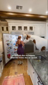The scene shifts to a bright and spacious kitchen, where Charlie has followed his human. A woman in a purple dress is looking into the refrigerator, its door wide open, revealing a well-stocked interior. Charlie stands patiently beside her, peering over her shoulder with keen interest. He is a curious and perhaps hopeful onlooker, wondering if a tasty snack might emerge. His head is positioned right next to hers, sharing the moment of culinary decision. The caption expresses pure delight: “It makes me so happy that he loves me so much.” She interprets his constant proximity, as a clear sign of his deep affection. His desire to be with her, no matter the room or the activity, is the ultimate proof of their connection. The kitchen is beautifully appointed, with white, elegant cabinetry, and a large, stainless-steel refrigerator. Dark, veined countertops provide a dramatic contrast, while wooden floors add warmth to the space. Charlie’s colorful coat stands out, against the kitchen’s sophisticated palette. He looks perfectly natural in this domestic setting, as if he belongs amongst the appliances. This is another candid glimpse, into their wonderfully unconventional life. The moment is filled with adoration and humor, a horse hoping for a carrot from the fridge. It is a picture of domestic bliss, redefined to include a 1,000-pound friend. Their bond transcends typical pet-owner dynamics, evolving into a true partnership. Her joy is infectious, a celebration of the love she shares with Charlie. He is her shadow, her companion, and her greatest source of happiness.