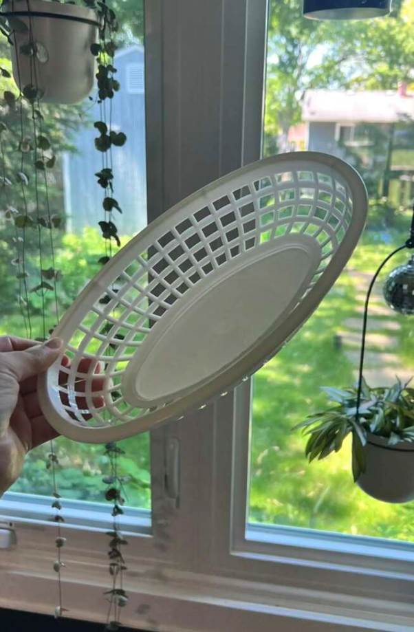 The kind usually seen at diners holding french fries or onion rings, the basket was small, sturdy, and lightweight. More importantly, its mesh-like base would keep twigs and leaves from slipping through, while still allowing drainage in case of rain.