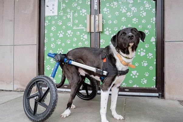 Recently, Dyson’s journey took a hopeful turn. Thanks to a generous donation from St. Francis Veterinary Clinic, Dyson received a custom dog wheelchair designed to support his back legs. For the first time in his life, he could move with ease and freedom.