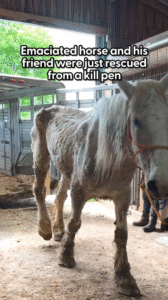 Pulled from the edge of a grim, final fate. Two equine souls were granted a reprieve. This skeletal figure, a ghost of a horse. Steps tentatively from the dark trailer. Into the first light of a new beginning. His emaciated frame tells a story of neglect. Every bone is a testament to his suffering. His matted, filthy coat has not known kindness. A holding pen where hope goes to die. He and his companion shared this terror. A silent, mutual understanding of fear. This is the moment of their liberation. The first step on a long, arduous journey. From the precipice of death to a glimmer of hope. His legs tremble with weakness and exhaustion. His head hangs low, a heavy weight of sorrow. The dust of the kill pen still clings to him. This is the raw, unfiltered image of rescue. Not a glorious charge, but a weary shuffle. A quiet exchange from one world to the next. His haunted eyes hold the horrors he has seen.Kind hands are here to guide him forward. Away from the darkness and into the light. A fragile existence, pulled from the brink. He is a survivor of unimaginable cruelty. His friend is right there, sharing this moment. Their shared trauma is now a shared rescue. This is the moment their healing can finally start. A final, desperate reprieve has been granted. Their long nightmare is finally at an end. The journey to recovery starts right now.