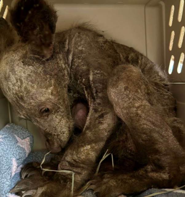 He was in terrible shape — dehydrated, anemic, and suffering from a severe skin infection that had left him nearly hairless. Instead of resembling a strong young bear, he looked frail and sickly, cowering in his crate and staring nervously at his oversized paws.