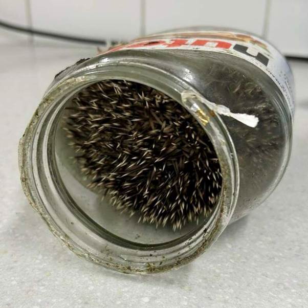 The hedgehog was too tightly wedged to free herself, and her fear only made matters harder. As soon as rescuers approached, she curled into a ball — a natural instinct that left only her sharp quills visible inside the narrow jar. Pulling her out by force could have caused injury, so the team needed to think creatively.