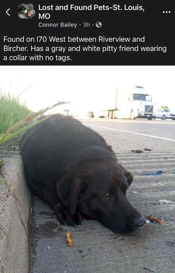 On an ordinary day in St. Louis, Missouri, a passerby named Connor Bailey noticed something that stopped him in his tracks. As cars roared past on a bustling highway, he spotted a black dog lying helplessly along the rumble strips. The pup was clearly hurt, and what made the scene even more heartbreaking was the presence of another dog — a gray-and-white pit bull — who refused to leave her friend’s side.