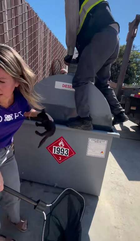 The tank itself posed its own challenges. Weighing nearly 3,500 pounds and still filled with fuel, it couldn’t be moved until emptied. Magee knew she needed someone with specialized equipment. She called the one person she trusted to handle the operation: David Loop, president of Sierra Pacific Furbabies rescue and also head of Sierra Pacific Electrical, a company with access to cranes and heavy-duty trucks.