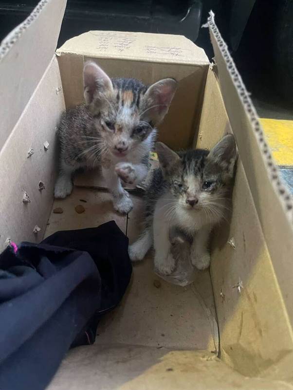 Following the sound, Valdez stepped outside and immediately spotted a small cardboard box left near her store’s entrance. Inside, two tiny kittens were curled up tightly together, their little bodies trembling from fear and exhaustion. Their eyes were crusted shut with mucus, and their weak cries told Valdez everything she needed to know: they had been abandoned and left to fend for themselves.