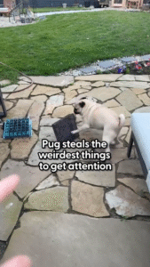 A mischievous pug embarks on a curious quest, across a flagstone patio with determined zest. This fawn-coated canine, with its signature wrinkled face, drags a peculiar treasure all over the place. The object of its thievery is a dark, square planter, an unusual choice for this four-legged enchanter. Its muscular little body strains with the effort, a comical display of pilfering for sport. The lush green lawn stretches out in the background, where colorful flowers in a garden bed are found. A cellular seedling tray lies abandoned nearby, a testament to gardening activities gone awry. The caption reveals the motive for this strange deed, a powerful, insatiable, attention-seeking need. This pup has learned that bizarre behavior gets a reaction, making larceny its primary mode of interaction. A human hand enters the frame from the lower left, a silent witness to this comical theft. The dog’s curled tail is held high in defiance, a tiny symbol of its self-reliance. He pulls his prize with a resolute might, a truly peculiar and amusing sight. This is no ordinary game of fetch and retrieve, but a calculated plot this little dog did conceive. His goal is not possession, but simply to be seen, a furry, fawn-colored, attention-fiending machine. The scene is a charming portrait of canine antics, a masterclass in roguish, playful semantics. This little bandit has stolen more than just a pot; he has captured the focus of the one that he’s got.