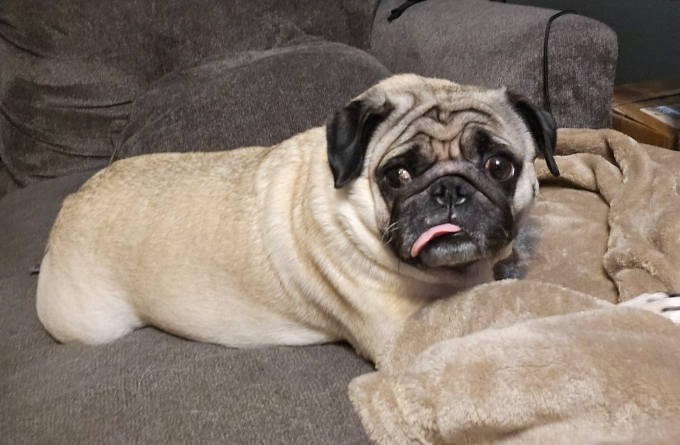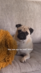 Now repositioned upon a comfortable grey settee, the little pug gazes out for all the world to see. Its large, dark eyes are filled with profound emotion, a carefully crafted, soul-stirring potion. The caption voices the owner’s exasperated plea, a question of “Why?” for this furry mystery. Beside the pup rests a fluffy, mustard-yellow plush, an object ignored in the kleptomaniac rush. His brow is furrowed with deep, expressive lines, a classic feature of the pug’s unique designs. The head is tilted in a gesture of pure confusion, as if to deny any mischievous intrusion. He seems to question the very accusation, a master of psychological manipulation. “Are you for real?” the human’s words inquire, fueled by a mix of love and frustrated fire. But the dog’s expression remains one of gentle woe, a silent, theatrical, heart-wrenching show. Its dark muzzle and velvety ears are a stark contrast, to the light-colored fur where his features are cast. He sits with a posture of perfect, poised stillness, projecting an aura of undeserved illness. This is the face that melts a frustrated owner’s heart, a work of adorable, manipulative art. He has perfected the art of the guilt-inducing stare, a look that says, “How could you? It’s simply not fair.” The soft, textured fabric of the couch behind, frames a creature of a most cunning kind. He feigns bewilderment with incredible skill, remaining perfectly, deceptively still. This quiet moment is a battle of wills, where the pug’s cuteness cures all of life’s ills.