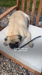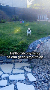 Under the bright glare of a radiant sun, the little pug’s outdoor mischief has just begun. He trots triumphantly across a verdant lawn, a new, peculiar prize seized at the break of dawn. Clutched firmly within his determined little jaw, is a small, white object, defying all natural law. The caption confirms his indiscriminate taste, “He’ll grab anything,” leaving no item uncased. His tiny legs carry him with a confident stride, with absolutely nothing to hide. A decorative border of smooth river stones, marks the edge of the garden he proudly roams. In the distance, a dark fence encloses the space, but cannot contain the spirit of this playful chase. The sunlight creates a brilliant, hazy flare, highlighting the sheer joy in the open air. He is a collector of the random and the mundane, finding adventure in the sun and the rain. This particular item, rectangular and bright, is held like a trophy, a beacon of light. His focus is singular, his mission is clear, to abscond with whatever happens to be near. The world is his treasure chest, full of things to procure, a habit for which there seems to be no cure. This image captures his essence, wild and free, a tiny marauder filled with boundless glee. The green grass serves as his personal domain, where his quirky, larcenous habits reign. He is on the move, a blur of fawn-colored fur, a happy, determined, and unstoppable purloiner.
