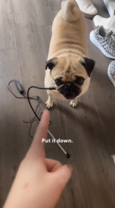 The scene now shifts to an indoor confrontation, a moment of tense, domestic negotiation. Positioned on a floor of grey, wood-look laminate, the pug stands his ground, his resolve consummate. He gazes upwards with wide, unblinking eyes, as a human finger points, a warning it implies. The contraband this time is a perilous selection, an electrical cord, defying all protection. A slender LED light strip dangles from the wire, a situation that is truly dire. The owner’s command is simple, firm, and down, “Put it down,” spoken with a serious frown. Yet the pug seems to ponder this direct request, putting his owner’s authority to the test. His expression is a mixture of innocence and guile, holding the forbidden object for a little while. In the background, other shoes are scattered about, lending a sense of lived-in, chaotic clout. The tangled black cord is a stark, dangerous line, a hazardous new treasure he wants to make his. This is a power struggle, a battle of command, between the willful creature and the guiding hand. His little body is poised, ready to bolt or to play, unaware of the danger he’s courting today. The close-up perspective intensifies the mood, a silent debate between the creature and his food. He has chosen an object of significant alarm, risking not just trouble, but genuine harm. The owner’s finger is a symbol of their care, a desperate attempt to manage this affair. The pug’s blatant disregard for the rules is on display, in this tense, electrically charged tableau.