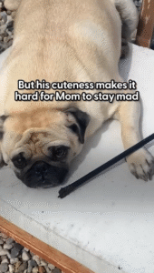 Here, the little pug deploys his ultimate power, in this difficult, disciplinary hour. He lies completely prostrate on a white outdoor seat, looking the very picture of pathetic defeat. His head is resting flat upon the cushion’s surface, projecting an aura of sorrowful purpose. His deeply wrinkled brow and droopy, sad eyes, are his most effective, heart-wrenching disguise. The caption explains this powerful, natural charm, that protects the little creature from any real harm. His undeniable cuteness makes it very hard, for his loving mother to maintain her guard. It is impossible to stay angry for too long, when faced with a creature who looks so wronged. He has mastered the art of the sorrowful pose, the most effective defense that anybody knows. Beside him lies the evidence of his latest sin, a slender black object he has recently brought in. But his mournful expression absolves him of the crime, working its magic every single time. He looks up from his low vantage point with a plea, for forgiveness, for love, and for sympathy. This strategic surrender is a brilliant move, his inherent adorableness he continues to prove. He has transformed from a scoundrel into a victim, a tactical shift within his emotional system. The sunlight bathes him in a warm, gentle glow, amplifying the pathos of his sorrowful show. No amount of mischief can truly be condemned, when by such overwhelming cuteness it is hemmed. He is a master of emotional jujitsu, a skill that will always continue to see him through.