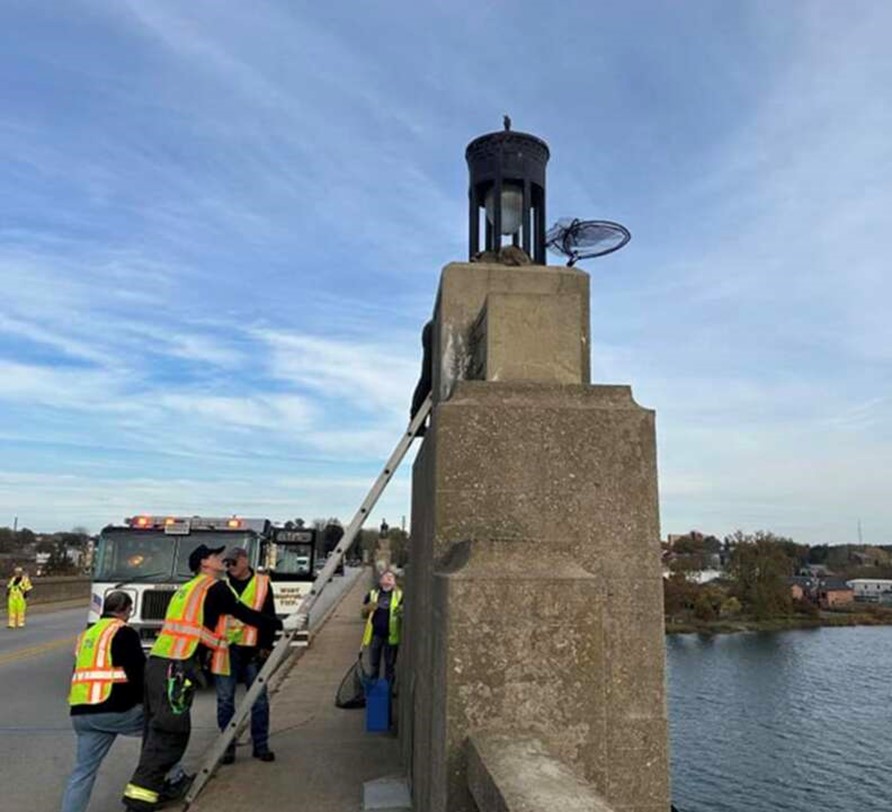 With the assistance of local police, Raven Ridge rescuers climbed onto the narrow bridge platform, nearly 100 feet above the icy river. The plan was simple but risky: net the raccoon and bring him safely back to land.