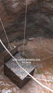 Into the bleak despair of the leopard’s watery prison, a new element descends, breaking the vertical lines of the well and signaling a dramatic shift in the narrative. This image documents the first tangible glimmer of hope, the arrival of a potential lifeline from the world above. A large, sturdy-looking cage, its form stark and geometric against the organic texture of the earthen walls, is carefully being lowered by a network of thick, taut ropes. Its presence introduces a foreign, man-made object into this scene of natural struggle, a symbol of human intervention. The cage panels are adorned with a camouflage pattern, a thoughtful, albeit slightly ironic, attempt to make the intimidating metal structure appear less alien to the wild animal. Its body is still largely submerged, but its head is raised, its attention fully captured. The text overlay provides the crucial context for this intervention: a call for help was made to Wildlife SOS, a name that signifies expertise and compassion in the realm of animal rescue. This is not a random act but a coordinated, professional response to the creature’s plight. The ropes, pulled by unseen hands, are the physical connection between the trapped animal and its saviors, a fragile yet determined link spanning the fifty-foot divide. One can almost imagine the quiet commands and the focused effort taking place at the lip of the well, a team working in unison to guide the cage safely down. For the leopard, this descending box is an enigma—is it a threat or a promise of salvation? Its cautious posture suggests it is weighing this very question, its survival instincts on high alert as it assesses this unexpected development in its dark, secluded world. The splash of water anticipates the cage’s arrival, marking the imminent meeting of the wild and its would-be rescuers.