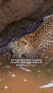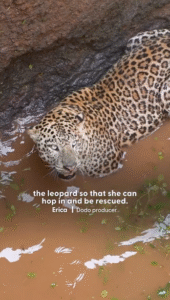 The perspective shifts to a high-angle view, looking down into the well as if from the vantage point of the rescuers themselves. This aerial shot provides a comprehensive look at the unfolding rescue operation, emphasizing the strategy and teamwork involved. The leopard remains the central focus, its beautifully patterned back a stark contrast to the murky brown water that surrounds it. From this angle, we can appreciate the sheer depth of the well and the animal’s complete inability to escape on its own. It is no longer snarling or panicked but appears to have entered a state of watchful waiting, its body angled towards the rescue apparatus. Its gaze is fixed upwards, tracking the cage’s deliberate and steady progress. The narration from Erica, the Dodo producer, gives a voice to the action, explaining that the team is working “all together” to “pulley the cage down.” This simple phrase underscores the critical importance of collaboration; a single individual could not perform this delicate task. It requires the combined strength and coordination of a dedicated group to manage the weight of the cage and the tension on the ropes, ensuring a slow, controlled descent that will not frighten the already traumatized animal. The pulley system, though unseen, is the mechanical heart of this operation, a tool of simple physics being used to overcome a life-threatening challenge. The leopard’s stillness is profound; it seems to be conserving its precious energy, placing a sliver of trust in the process unfolding above it. Its intelligence is palpable; it appears to be analyzing the situation, perhaps beginning to understand that this strange intrusion is not an attack but a deliberate and purposeful maneuver designed for its benefit. This frame is less about the animal’s immediate peril and more about the intricate dance of the rescue itself—a testament to human ingenuity and empathy directed towards saving a life.