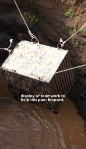 The focus momentarily shifts away from the leopard to highlight the rescue apparatus and the human element driving the operation. The camouflaged cage is seen suspended in mid-air, a heavy, solid object meticulously controlled by a web of ropes attached to its corners. This shot emphasizes the scale and complexity of the mission. The cage, which appeared as a simple box before, is now revealed to be a piece of specialized equipment, engineered for exactly this kind of situation. The thick ropes strain under the weight, testament to the forces at play. The dark, rugged texture of the well’s interior forms a dramatic backdrop, underscoring the hostile environment from which the leopard is being saved. The text overlay perfectly encapsulates the sentiment of the image, celebrating the “display of teamwork to help this poor leopard.” It is a tribute to the unseen heroes at the top of the well—the veterinarians, wildlife biologists, and rescue staff of Wildlife SOS. Their coordinated pulling and releasing of ropes, their shouted instructions, and their shared sense of purpose are the invisible forces guiding the cage on its path. This image is a powerful representation of interspecies compassion, where human skills and resources are marshaled for the sole purpose of alleviating the suffering of another living being. It speaks to a deep-seated empathy that transcends the boundary between man and beast. The “poor leopard” is not just an animal; it is a patient, a victim, and the beneficiary of a carefully executed plan rooted in a collective desire to protect and preserve wildlife. The deliberate, methodical nature of the cage’s descent showcases the professionalism and dedication of the rescue team, turning a dangerous and chaotic situation into a controlled and hopeful procedure. This is the heart of the rescue: humanity’s better nature in action.
