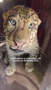 The final image in the sequence is the triumphant culmination of the entire ordeal, a portrait of success and relief. The leopard is now safely inside the rescue cage, the perilous water of the well replaced by the solid, reassuring feel of a grated metal floor beneath its paws. The camera captures a stunningly intimate, close-up view of the magnificent creature. Its ordeal is over, and its expression has transformed entirely. The fear and panic have subsided, replaced by a look of wide-eyed wonder and perhaps a lingering sense of shock. Its luminous, slightly bluish-green eyes stare directly into the lens, creating a powerful connection with the viewer. We are no longer observing a distant animal in peril; we are face-to-face with the survivor. The gash on its brow is a visible scar from its journey, a reminder of the danger it has overcome. Its whiskers twitch with curiosity, and its posture, while still cautious, is no longer defensive. It sits calmly, a temporary guest in this metal sanctuary that has lifted it from the depths. The text provides the joyful conclusion to its story: it is destined to be “released in a safe area, all thanks to Wildlife SOS.” This is not the end of its journey, but the beginning of a new chapter. The cage is not a permanent prison but a temporary transport, a vehicle back to the freedom of its natural habitat. This single frame encapsulates the entire purpose of the mission: not just to save a life, but to return a wild animal to the wild. It is a powerful testament to the effectiveness of the rescue team and a heartwarming affirmation of their dedication. The leopard’s silent, profound gaze serves as a final, unspoken thank you to the humans who showed it compassion and offered it a second chance at life.
