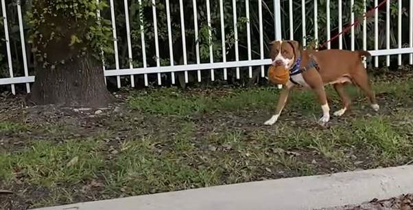 Every morning, when it was time for her potty break, Peanut insisted on bringing her stuffie along for the short walk outside. Staff laughed at the sight — a dignified senior pittie trotting out proudly with a plush hamburger or crocodile clutched in her jaws, tail wagging with delight.