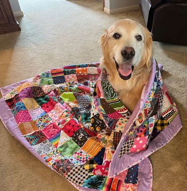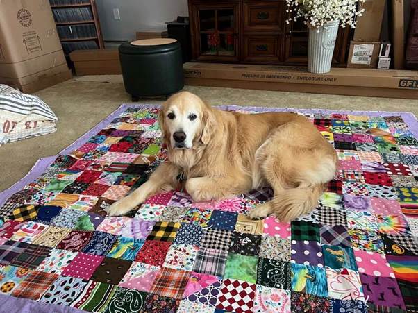 For Isabelle, the quilt was just as magical. She sniffed it curiously, wagged her tail and immediately lay down on its soft surface as though she recognized the familiar scents and textures. At one point, Logan even placed it gently over her head like a crown. Isabelle beamed, her golden coat glowing against the quilted fabric.