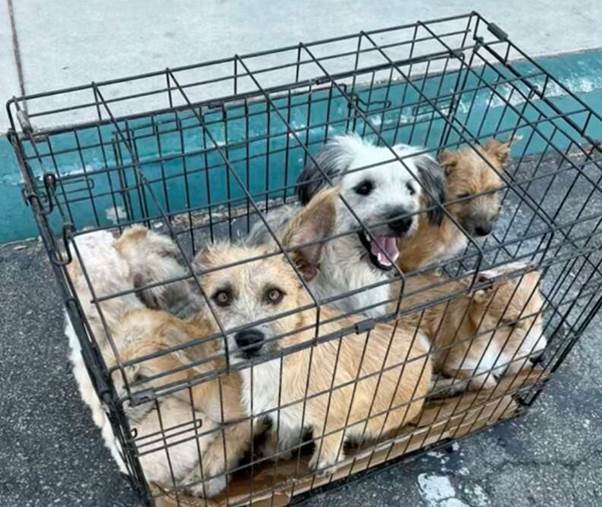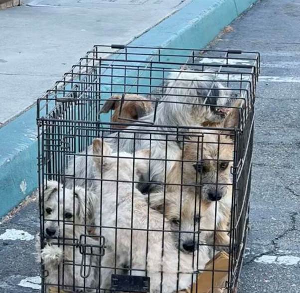 For Stephanie Castillo, a quick trip to run errands in Chino Hills, California, turned into an unforgettable moment. As she walked past Priceless Pet Rescue, her eyes caught something that made her stop cold: seven dogs packed tightly into one small cage, abandoned outside the building.