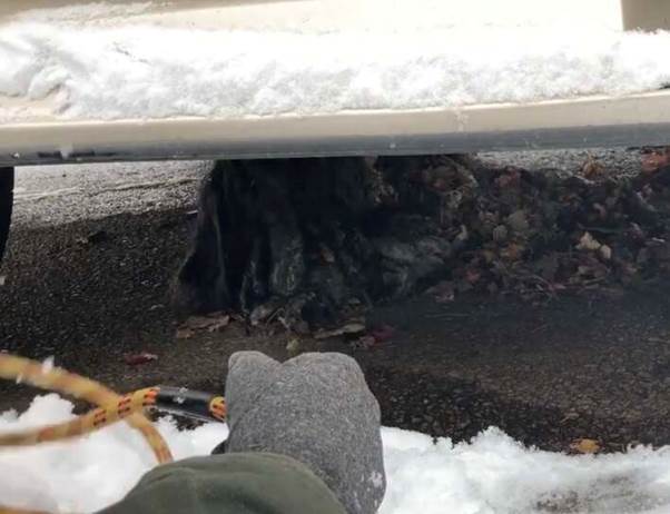 As she drove, her search came to an abrupt halt. Beneath a white van, she saw something that didn’t quite make sense—a mysterious, gray mound that seemed out of place against the snow-dusted concrete. It was just a lumpy, inanimate shape at first, but then, it moved. It was a slight, almost imperceptible shift, but it was enough. It was a sign of life, a flicker of existence in the biting cold.