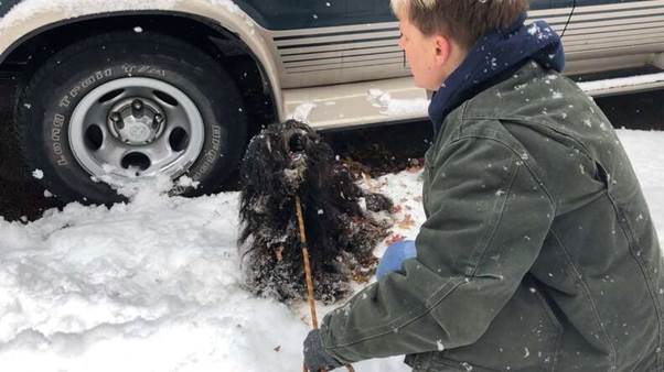 As she got closer, she realized she was looking at a horribly matted dog. The sheer weight of the clumps of hair, heavy with ice and grime, must have been pulling painfully at his skin with every shiver. But as she knelt down for a better look, a wave of horror washed over her. The situation was far worse than she had ever imagined. The poor pup was soaking wet from the melting snow, and the matted fur on his underside had fused with the ice on the pavement. He was, quite literally, frozen to the ground.