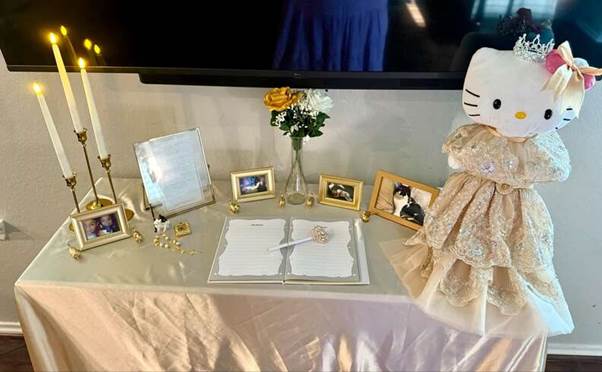 The cake was no less extravagant, layered and adorned with golden roses. Around the venue, tables were decorated with framed pictures of Holly throughout her life — from her kitten days to her elegant adult years. Guests signed a memory book, leaving heartfelt notes about the cat who had touched all their lives in some way.