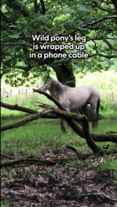 In a lush, green forest, a crisis unfolds. A beautiful wild pony is in grave danger. His leg has become entangled in a phone cable. A man-made object creating a natural nightmare. The white horse stands amidst the verdant foliage. Moss-covered branches lay on the forest floor. The scene should be one of peace and serenity. Instead, it is a picture of a perilous predicament. The animal is caught, a prisoner in his own home. The cable is a treacherous, unnatural snare. This is a heartbreaking and dangerous situation. The creature’s freedom has been cruelly stolen. He is a beautiful, dapple-gray equine. His long mane is a cascade of white. He stands silently, caught in the trap. This is a stark reminder of humanity’s impact. Our discarded technology can be a deadly threat. The serene woodland has become a place of peril. The poor creature is completely helpless. His beautiful, natural world has been compromised. A tragic, and all too common, scene. The pony’s majestic form is a stark contrast. To the ugly, dangerous wire that binds him. A beautiful animal in a terrible situation. A silent plea for help from the wilderness. This is where the rescue story begins. A moment of crisis in a tranquil forest. The first glimpse of the pony’s terrible plight. A beautiful creature in need of urgent assistance. A heartbreaking sight in a beautiful place. The beautiful forest holds a sad secret. A wild animal ensnared by human carelessness. A truly tragic and upsetting discovery. The need for intervention is immediately clear. A life hangs in the balance in this green prison.