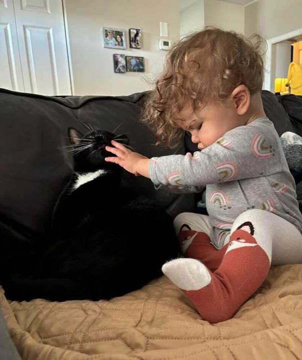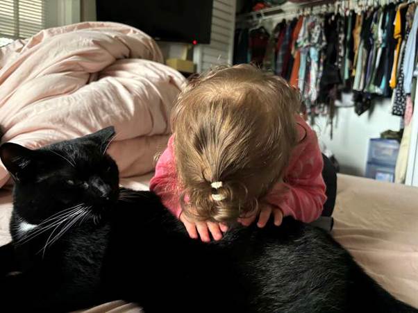 Wheatie became Zelda’s shadow, her four-legged guide, and her fierce protector. When Zelda, now a 19-month-old toddler, navigates the hallway, Wheatie walks alongside her, her sleek body consistently rubbing against Zelda’s legs, a living, purring guidepost in the darkness, a tactile map to say, “You’re on the right path.” She is more focused, more deliberate when trying to get Zelda’s attention than with anyone else. She seems to strategically lead the little girl to particular spots, with a gentle nudge or a soft meow, as if to say, “Hey, over here is your favorite toy,” or “Come this way, Mom is over here.”