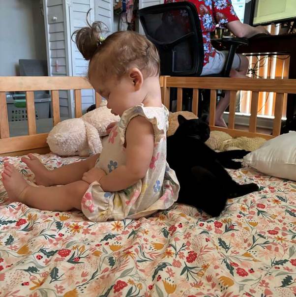 Her protective instincts are fierce and immediate. If any of the other, much larger, pets get too close to Zelda, Wheatie will come “zooming in out of nowhere” to place herself between them, a furry guardian making sure her best friend is safe and undisturbed. She is Zelda’s own personal secret service agent, a sleek black cat who has appointed herself the head of the toddler’s security detail.