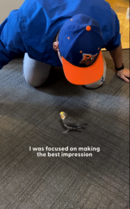 My overall strategy had to evolve. I needed a completely different approach. To gain his trust, I had to show deference. This moment required a grand gesture. So, I lowered myself to his territory. Meeting him on his own familiar level. The floor became our neutral meeting ground. A new space for peaceful negotiations. My posture was one of deliberate respect. A bow to the tiny king of this home. I was focused with a singular purpose. My mission: to establish a positive rapport. To prove I was not some towering menace. But a potential ally and future companion. He watched my actions with a sharp mind. His tiny footsteps were careful and precise. He was evaluating my entire character. This was my crucial ambassadorial moment. A presentation of my peaceful intentions. I wanted him to perceive me differently. Not as a competitor for her attention. But as a new source of fun and safety. My whole being was focused on this goal. Projecting a calm and non-threatening aura. This was much more than just a game. It was a foundational act of our future. I would do absolutely whatever it took. To make this unique family dynamic work. The impression I made had to be perfect. My commitment had to be clearly visible. This bird deserved my genuine respect.