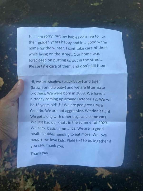 The message revealed the heartbreaking truth: their owner had lost their home to foreclosure and was now living on the streets. Unable to care for their beloved pets through the harsh winter, they had made the painful decision to leave them somewhere safe.