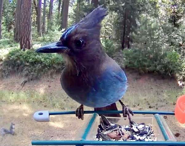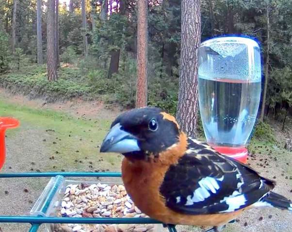 Next came the birds Brad had hoped for: a handsome black-headed grosbeak, a mischievous Steller’s jay, and a plump band-tailed pigeon. Each perched neatly, grabbed some seeds, and flapped away without incident. If only all his visitors were this polite.